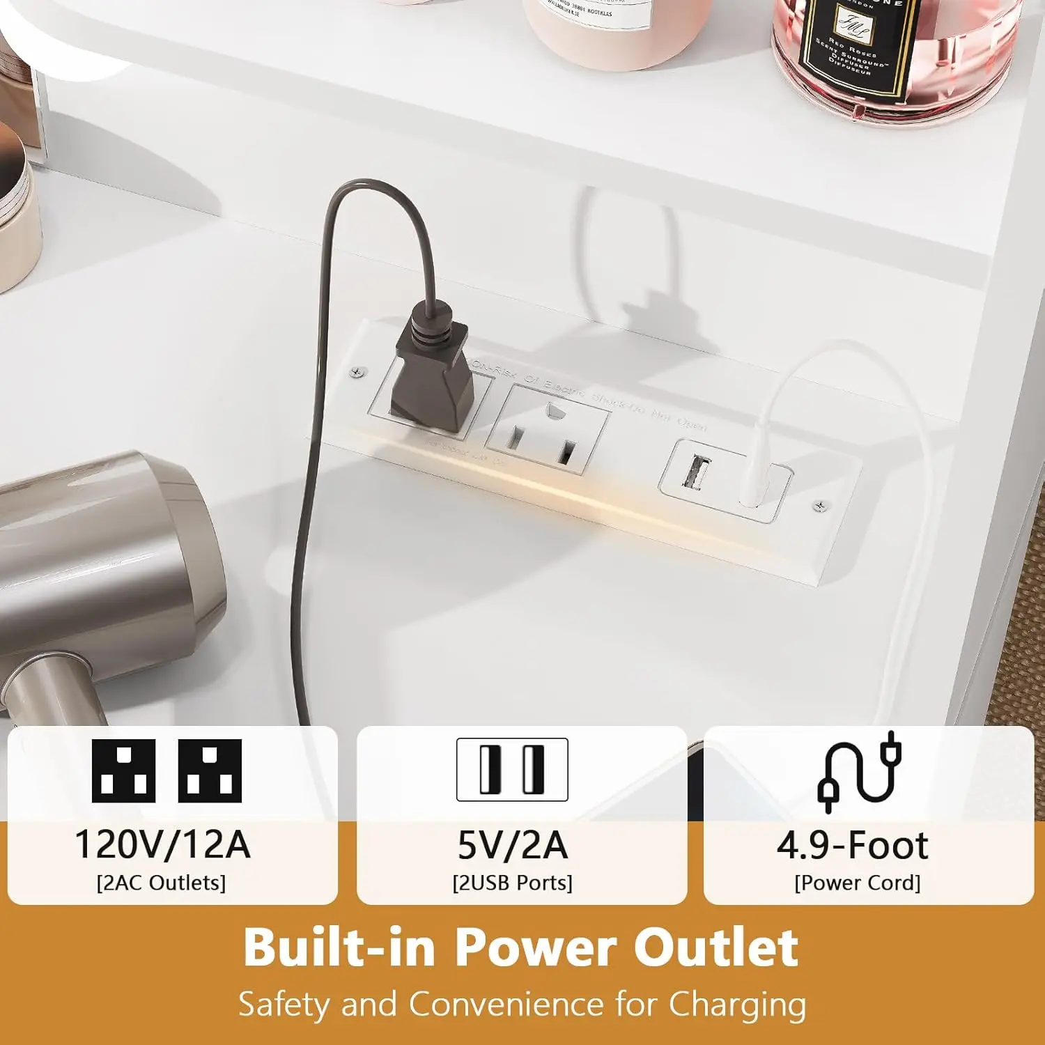 • Built-in Charging Station: Having the plugs in the front makes life so much easier! This vanity table add 2 standard plug sockets and 2 USB ports, more convenient for curling iron, beauty device, hair dryer and phone charging. Nice make up vanity for dressing room, salon or live broadcast