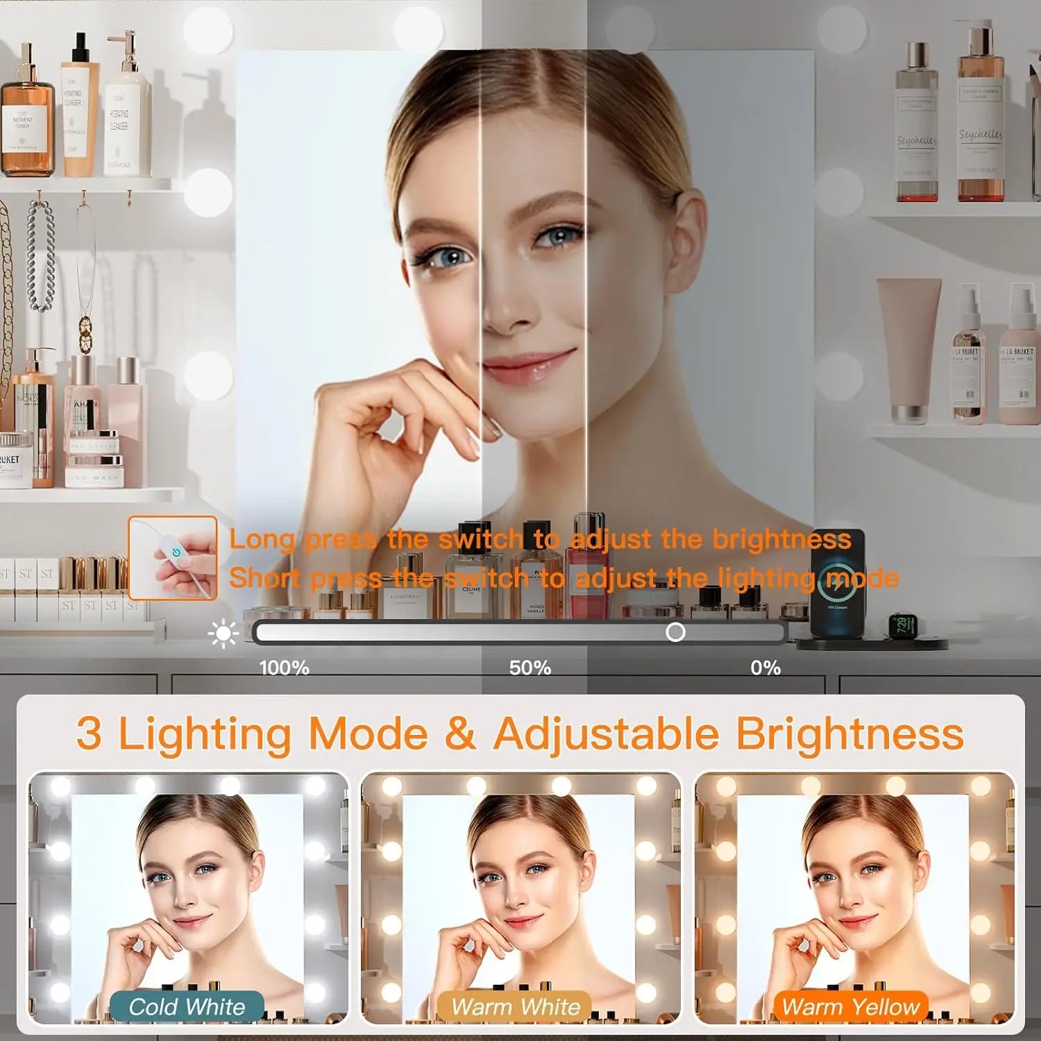 • Large Mirror with 3 Color Lighting Modes: The HD large mirror of the makeup vanity with 3 different color modes: warm yellow, warm white and cold white, can adjust the brightness according to different scenes and makeup needs by press the switch
